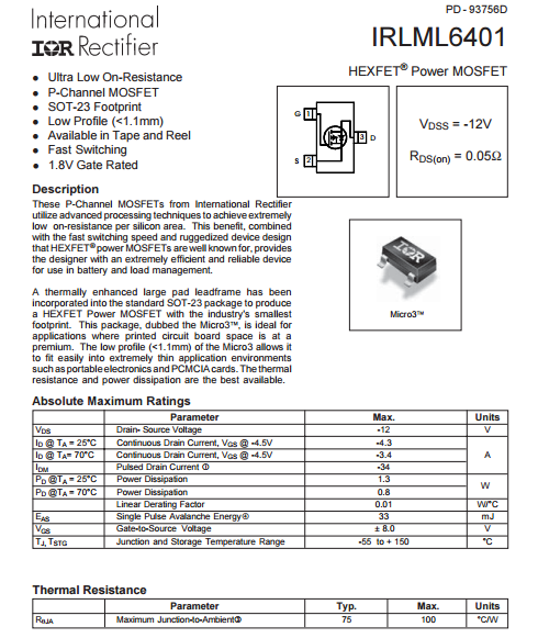 IRLML6401 P KANAL 4.3A 12V SOT-23 I&R Mosfet